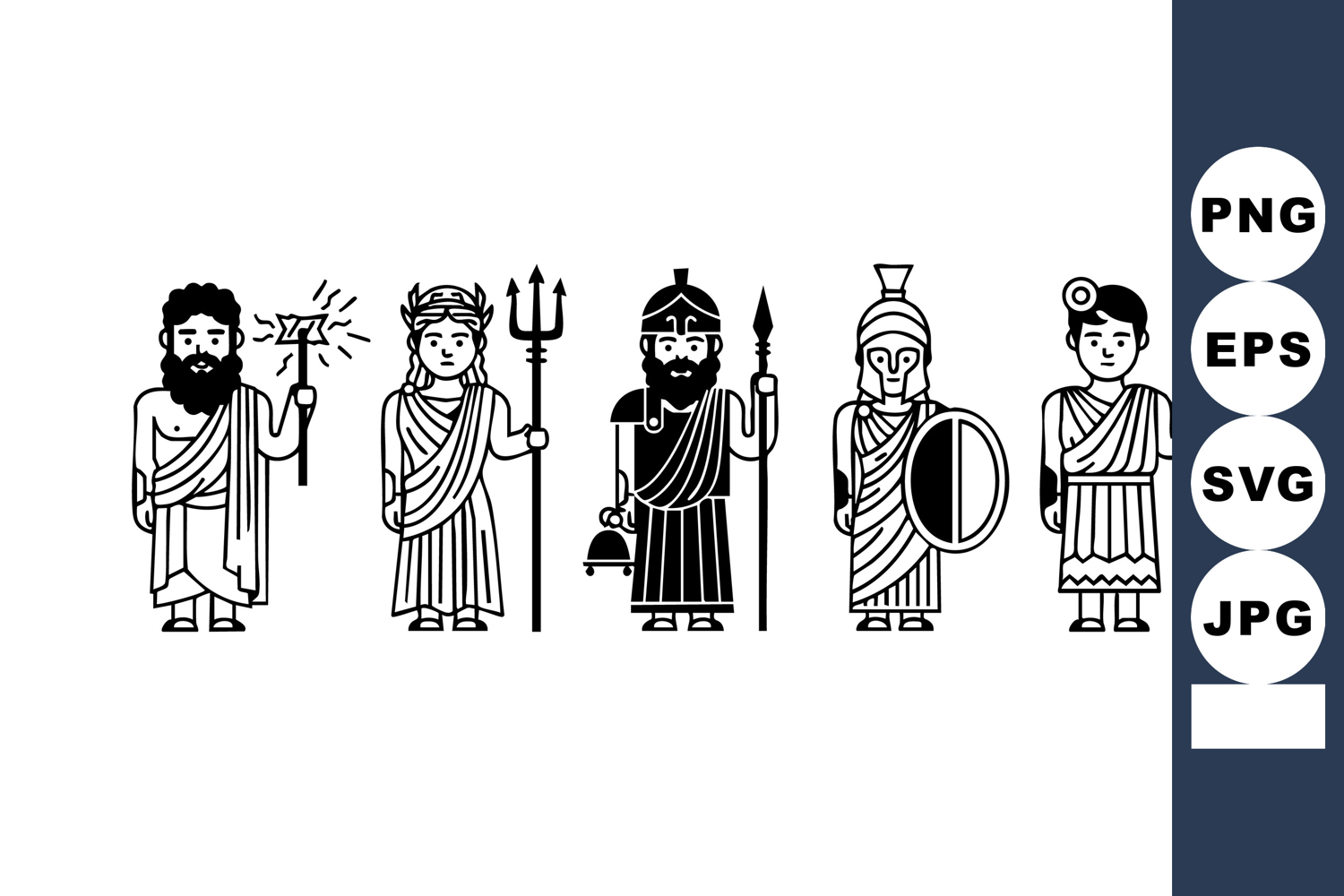 This vector features black and white Greek gods and goddesses holding various weapons and symbols representing ancient mythology in a clean and simple style. Mythological, classic, historical, mysterious, artistic.