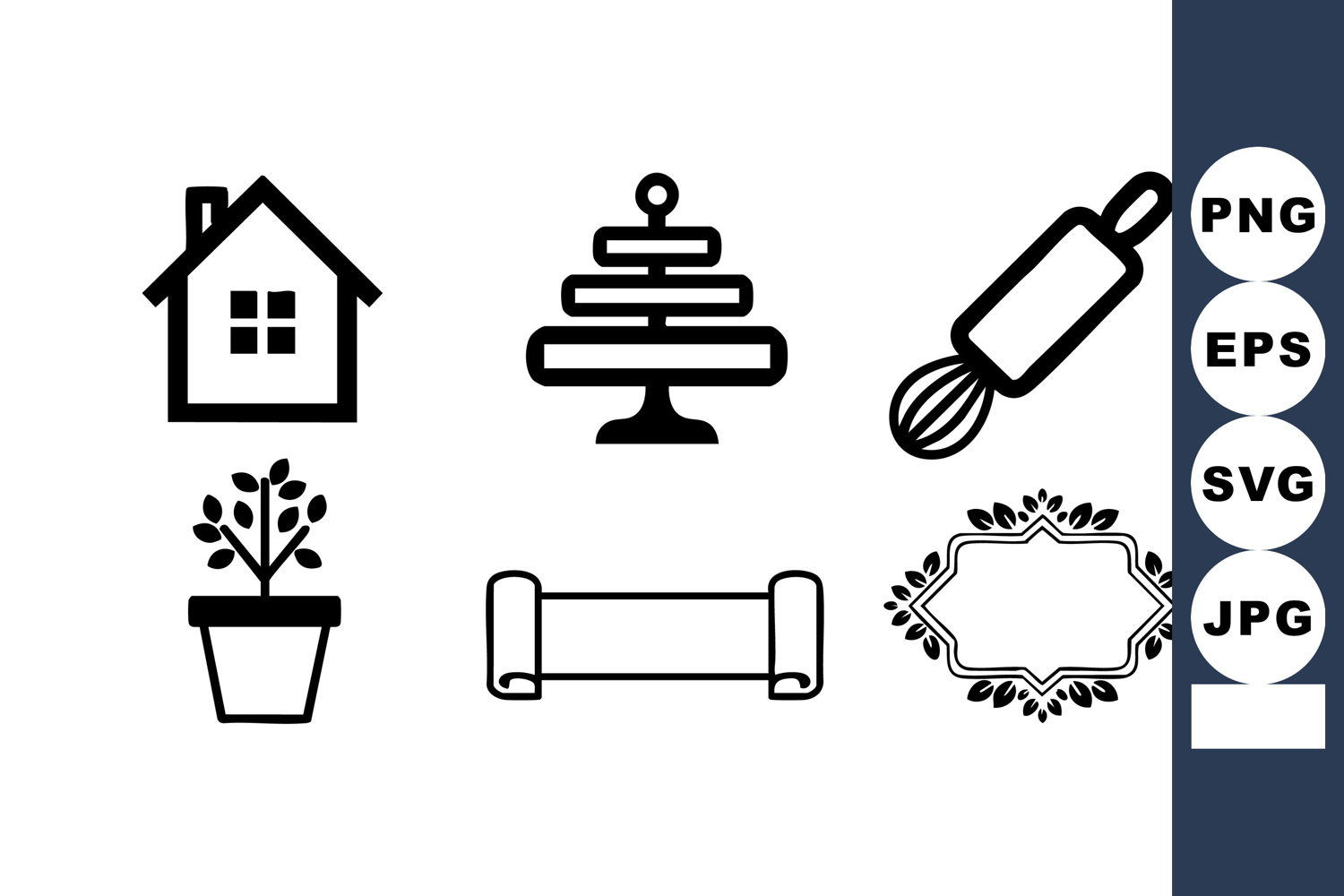 Vector icons showing home, plant, cake stand, rolling pin, scroll, and decorative frame in simple black outline style. Suitable for kitchen and home design projects. Clean and modern mood.