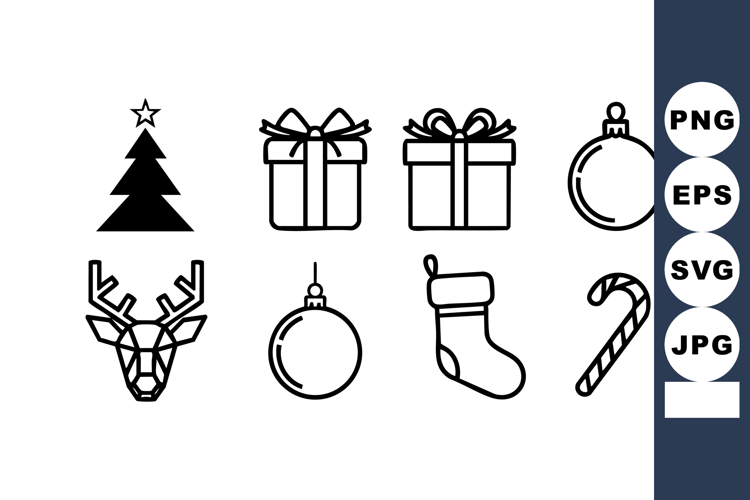 This vector set displays Christmas holiday icons including a tree, gifts, baubles, reindeer, stocking, and candy cane in a clean black line style, creating a festive and cheerful mood.