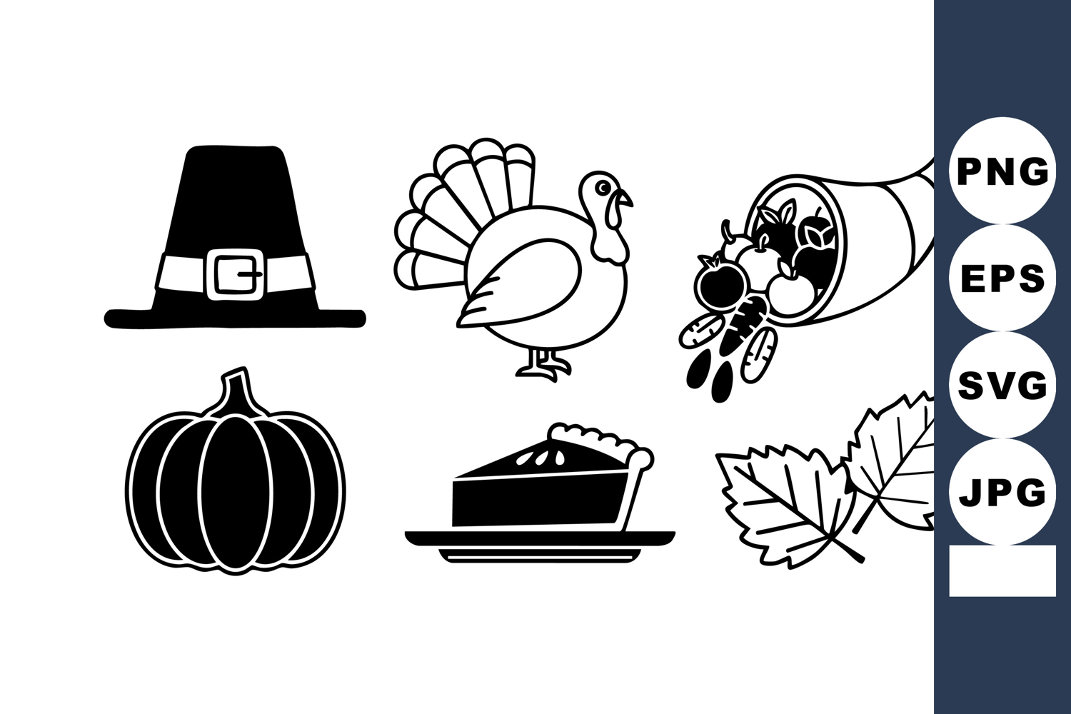 Vector set shows classic Thanksgiving icons such as pilgrim hat, turkey, pumpkin, pie, cornucopia, and autumn leaves in simple black and white style. Festive and traditional mood.