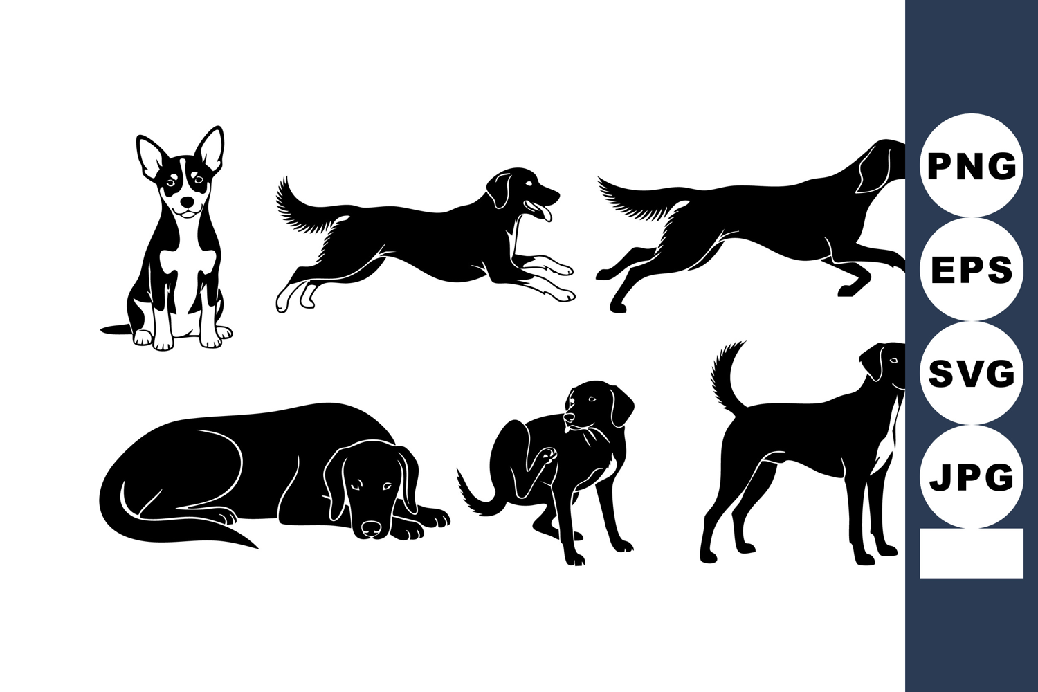 Vector illustration shows black silhouette dogs in different poses including sitting, running, and standing, providing clean and minimal animal shapes. Design appears modern and clear. Calm mood.