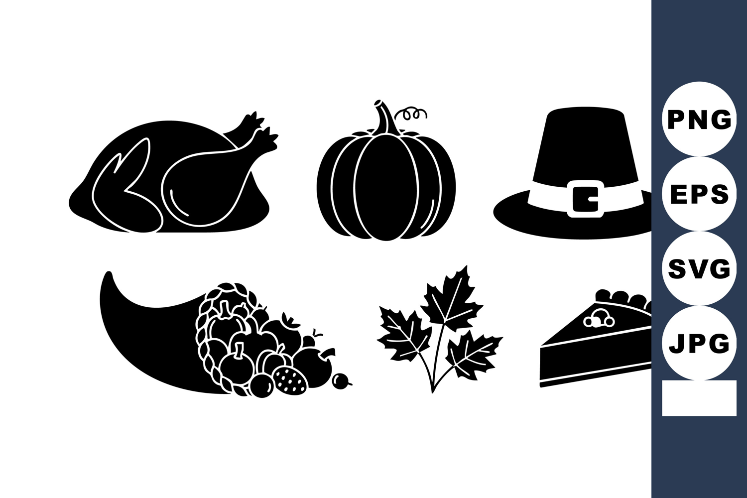 Black silhouette icons representing Thanksgiving elements including turkey, pumpkin, pilgrim hat, cornucopia, autumn leaves, and pie. Festive and seasonal mood.