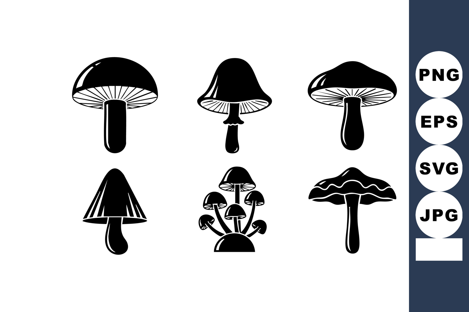 This vector features six black silhouette mushrooms with different cap shapes and stems, suitable for nature, botanical, and organic design projects. Simple and versatile style creates a natural mood.