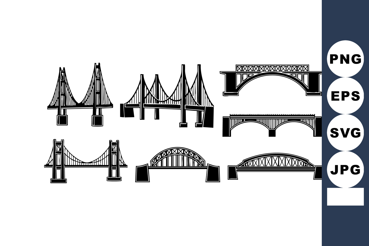 This vector image presents black silhouette bridges including suspension, arch, and truss designs. It suits architectural, engineering, and construction themes with a clean, professional mood.