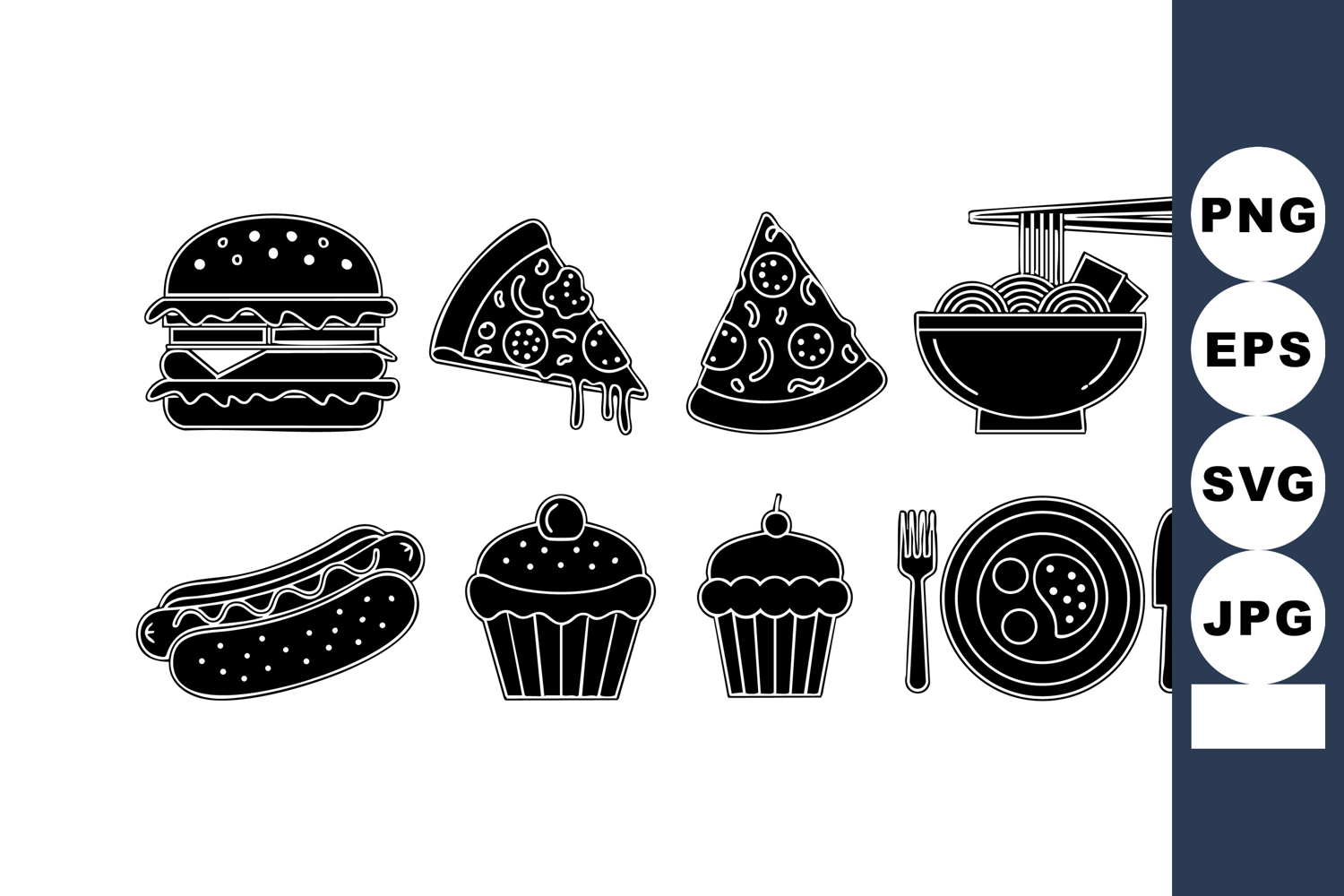 Vector set of fast food icons featuring burger, pizza slices, hot dog, noodles, cupcakes, and a dining plate with fork and knife, presented in black silhouette style. Simple and clear design, modern and clean.