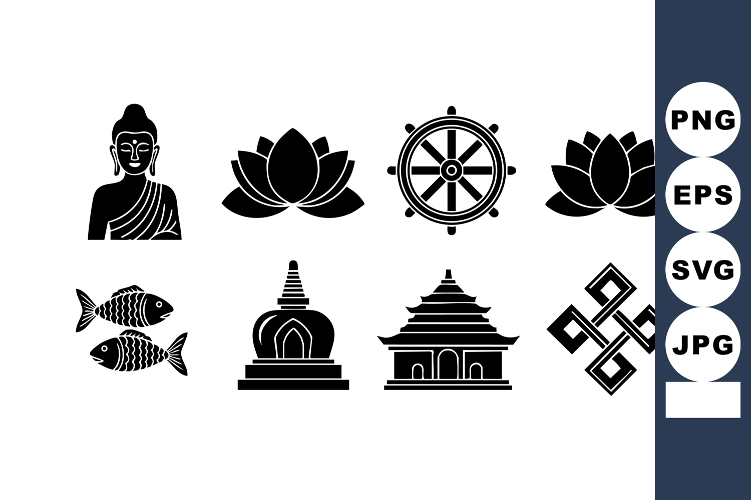This vector set features Buddha statue, lotus flowers, dharma wheel, fish, temple, stupa, and endless knot icons in black silhouette style, conveying spirituality and peace. Calm mood.