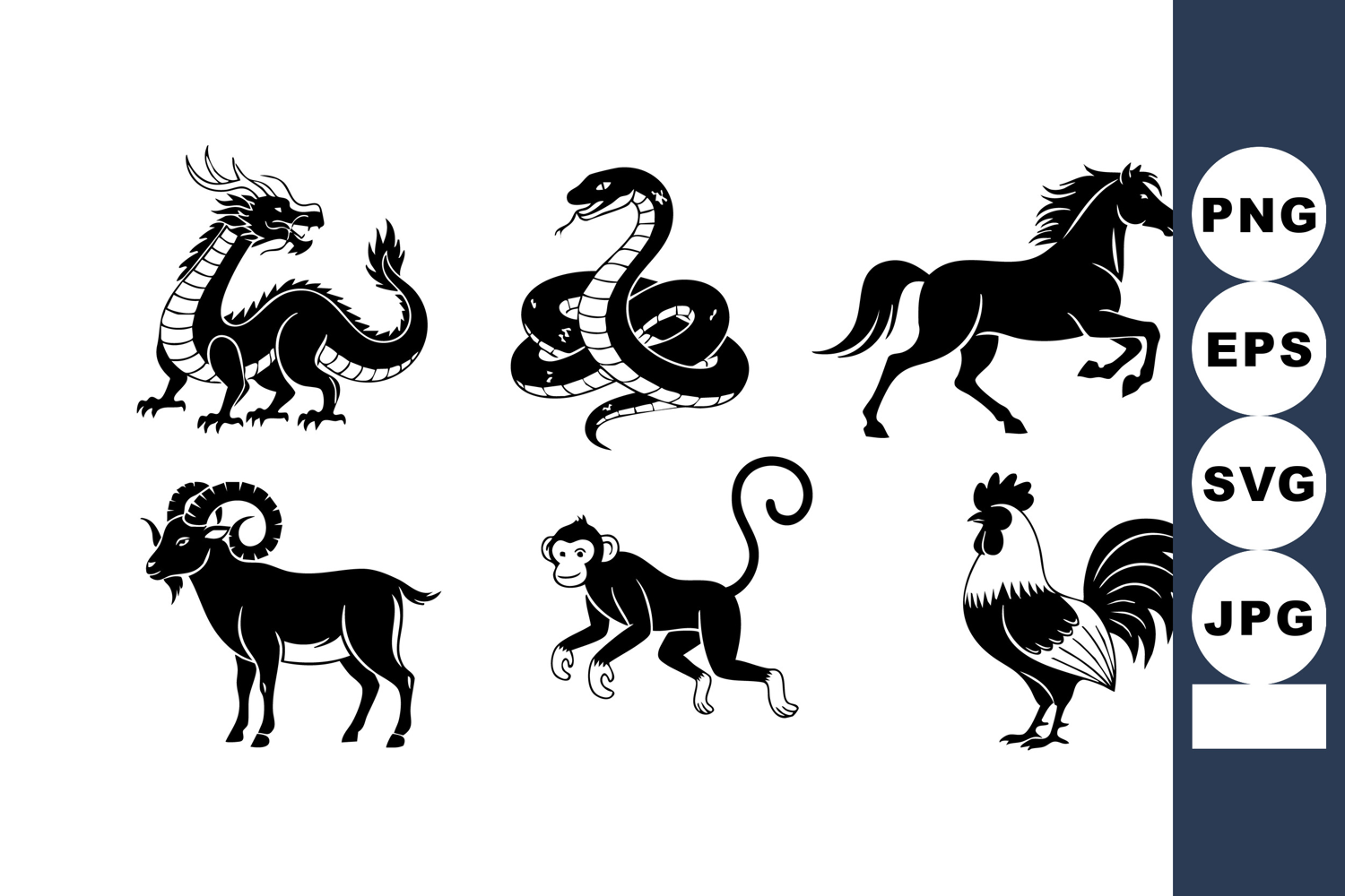 This vector set features six black silhouette Chinese zodiac animals: dragon, snake, horse, goat, monkey, and rooster. The design is clean and bold, creating a striking impression. Elegant.