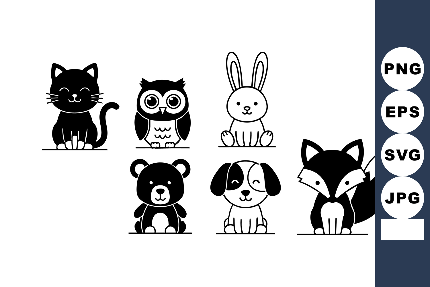 This vector illustration shows cute cartoon silhouettes of a cat, owl, rabbit, bear, dog, and fox in black and white, perfect for children’s designs and playful projects. Cheerful mood.