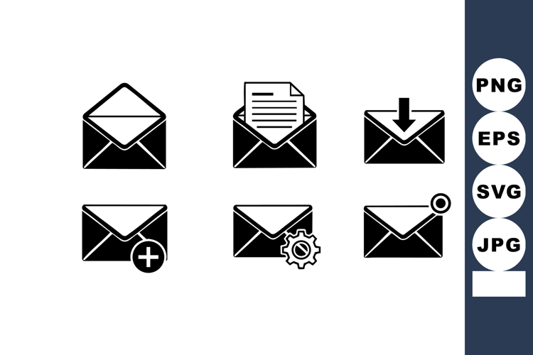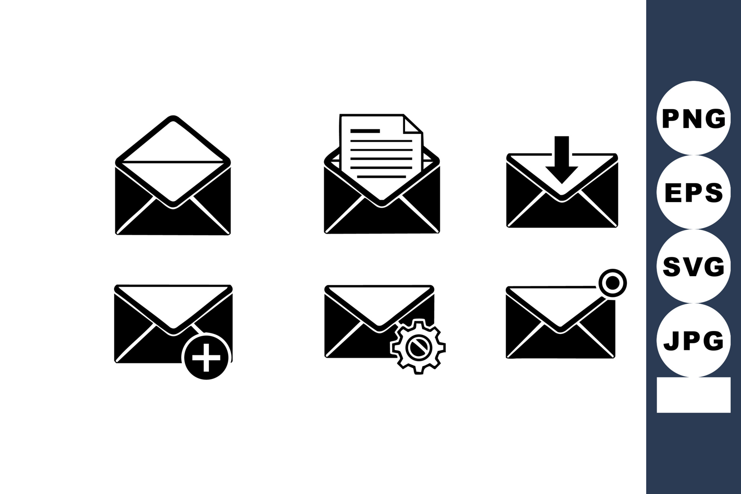 Collection of black and white envelope icons representing email functions including message, download, add, and settings in a clean vector style. Simple and modern design, professional.