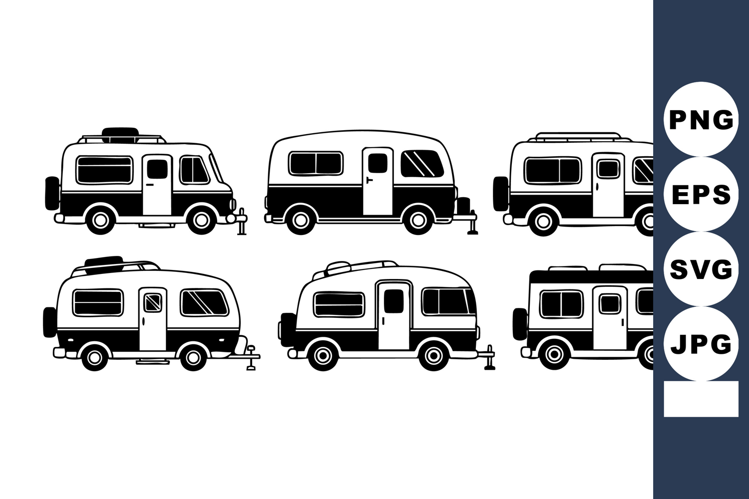 Collection of black silhouette camper trailers in various styles suitable for travel, camping, and adventure themes, presented in a clean vector format. Calm and versatile.
