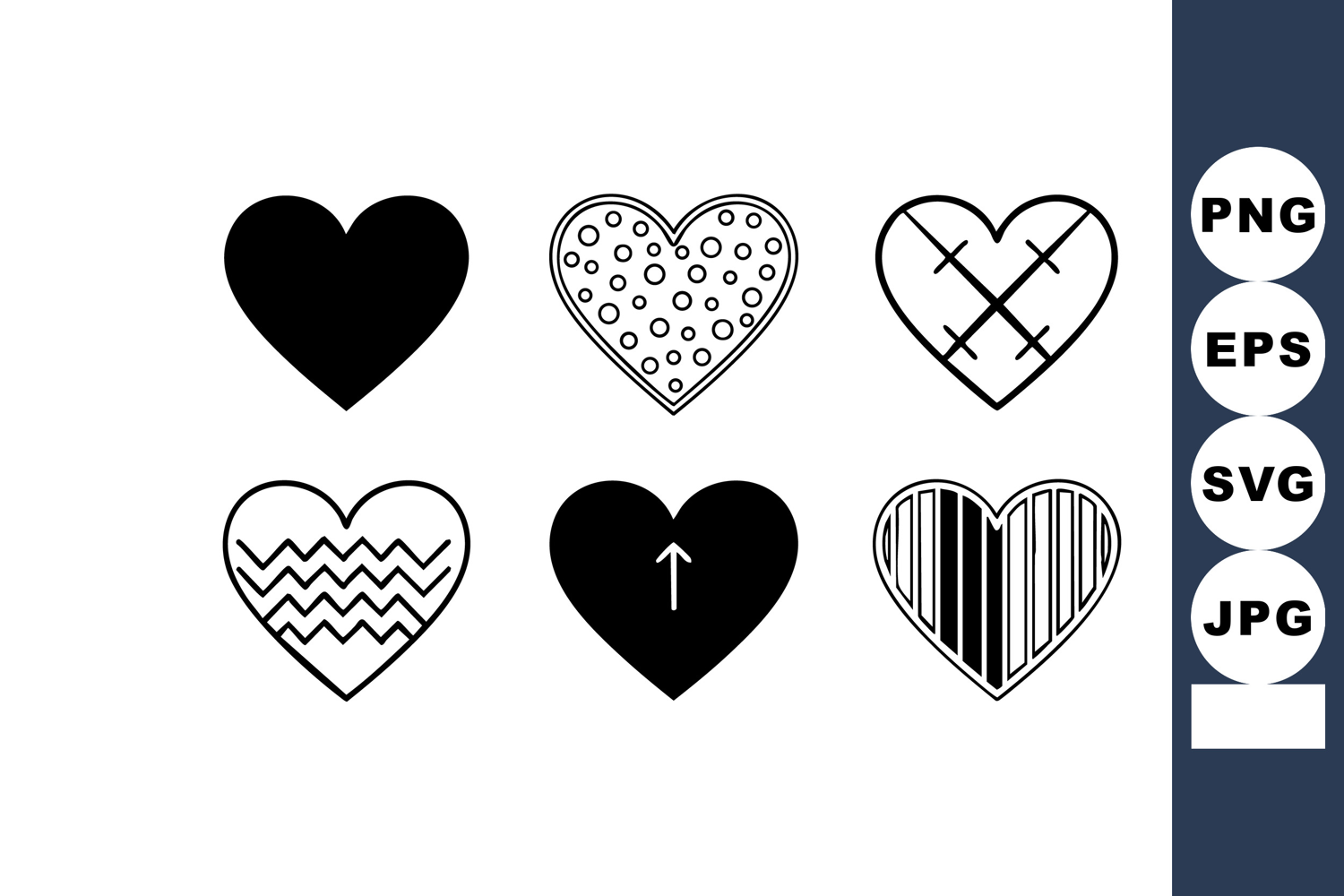 This vector image presents six distinct heart shapes featuring solid fill and diverse line patterns in black and white, suitable for love-themed or decorative projects, artistic mood.