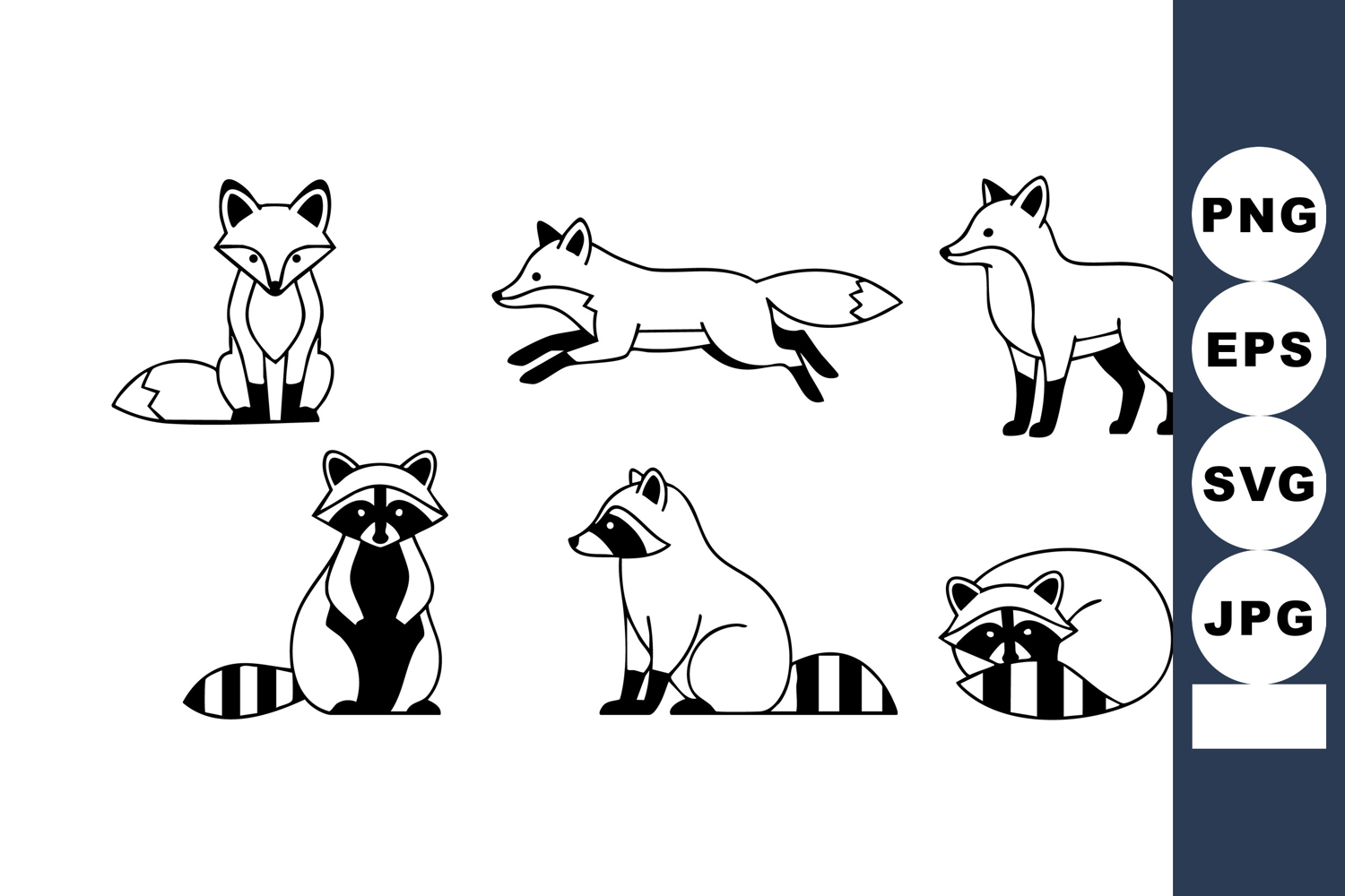This vector features six black and white fox and raccoon animals in various poses, showcasing minimalistic wildlife design for nature-themed projects. Clean and charming style.