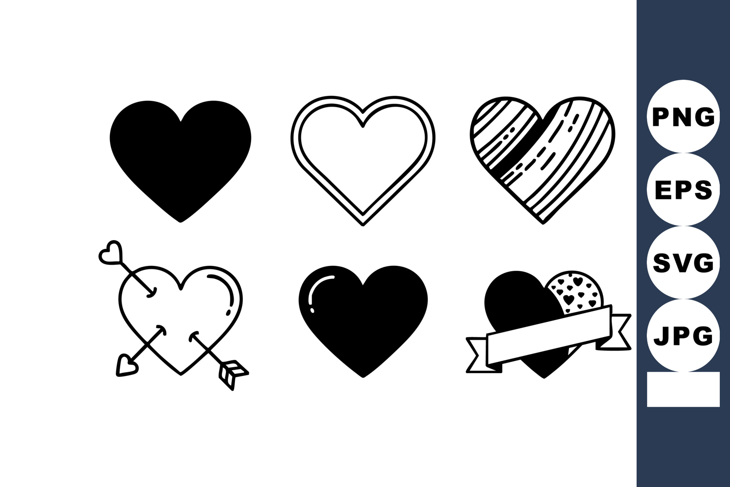 This vector file features six heart icons including solid, outline, patterned, and arrowed hearts with a ribbon element, perfect for love and romance themed designs. Simple and versatile style.