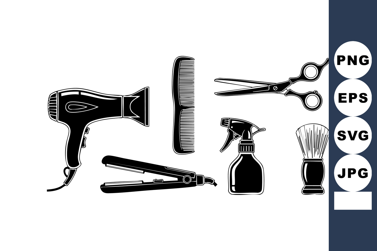 Vector illustration showing essential hair styling tools including a hairdryer, comb, scissors, spray bottle, straightener, and brush in black and white silhouette style, professional and clean.