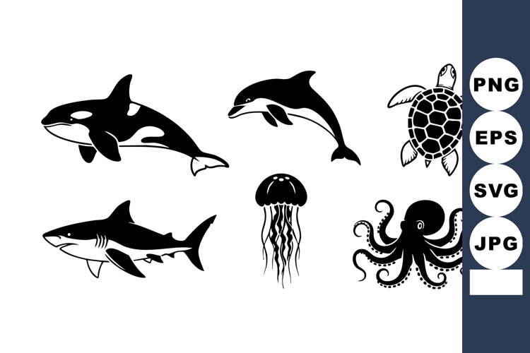 Vector set features black silhouettes of common marine animals including dolphin, orca, shark, turtle, jellyfish, and octopus in simple style for creative and educational use. Clean and versatile.