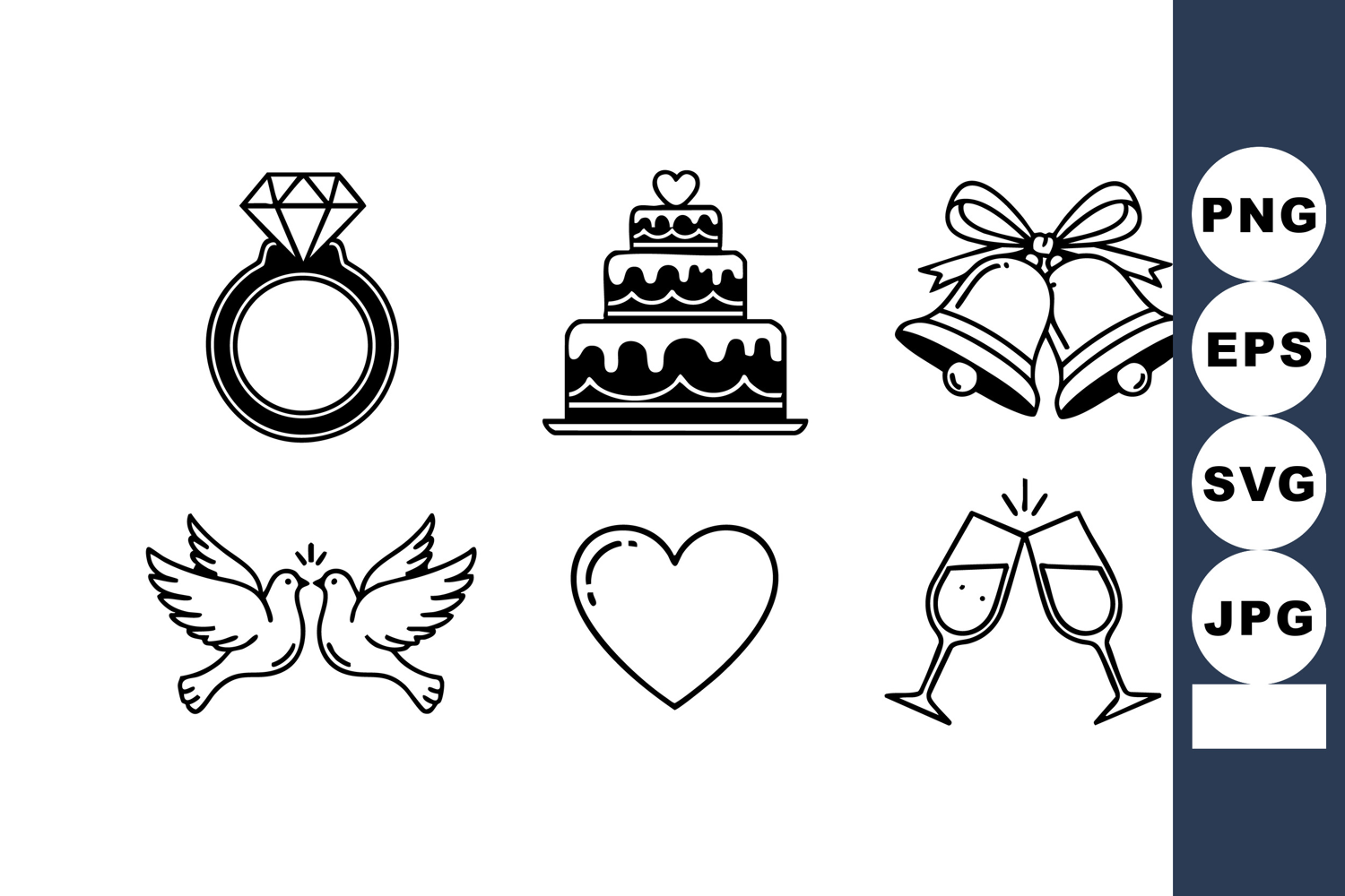Vector collection of wedding symbols including diamond ring, tiered cake, doves, heart, bells, and clinking glasses representing marriage celebration in elegant black line style. Romantic mood.