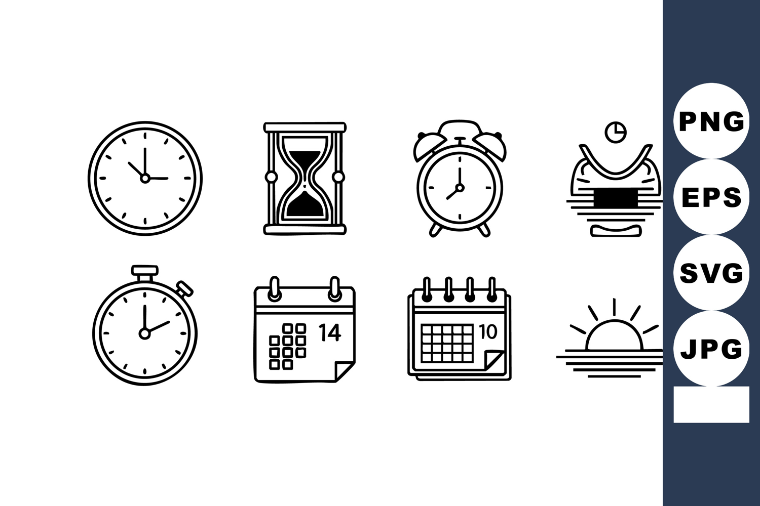 A set of black and white time management icons including clock, stopwatch, calendar, hourglass, alarm clock, and sunrise vector symbols. Clean and minimalist style. Functional and clear design. Calm.