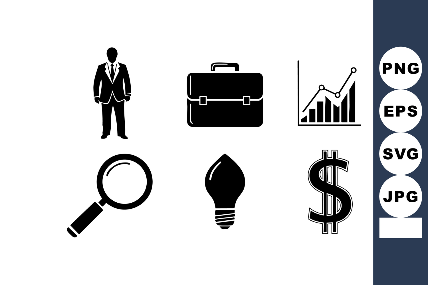 This vector features black business icons including a businessman, briefcase, magnifying glass, light bulb, dollar sign, and a rising graph, representing success and innovation. Professional mood.