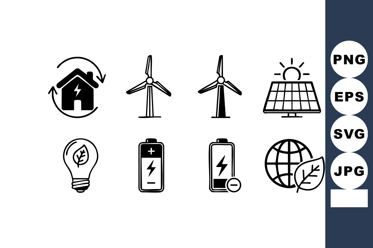 Vector set showing renewable energy icons including wind turbines, solar panel, battery, and eco light bulb representing sustainable power and environmental care. Clean and modern style.