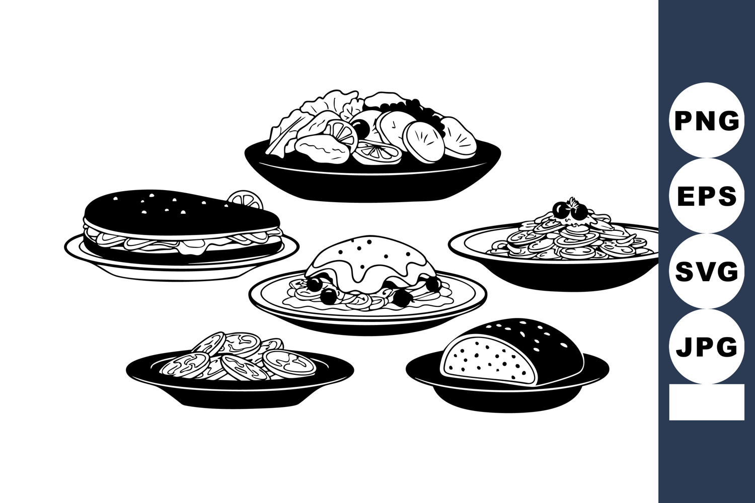 Vector illustration shows black and white assorted Mexican food plates including tacos, burritos, enchiladas, and salad arranged in a flat layout. Simple and crisp style, appetizing mood.