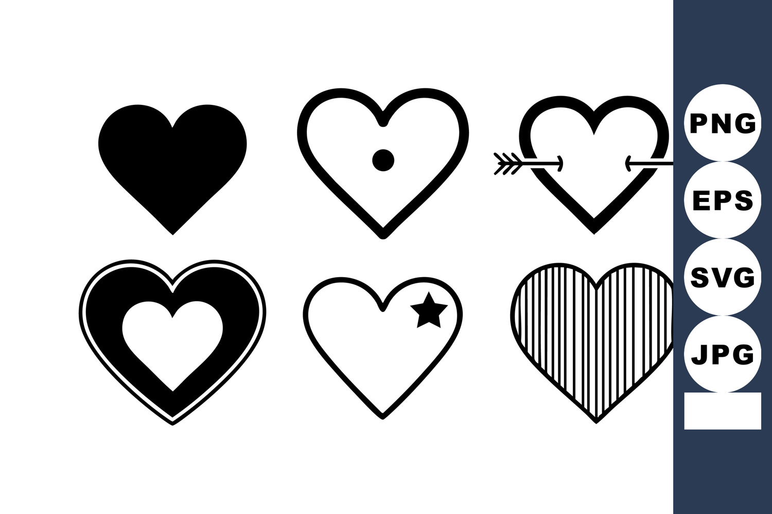 A collection of six black and white heart icons representing love, romance, and affection in different styles and shapes, designed for creative use. Simple and elegant mood.