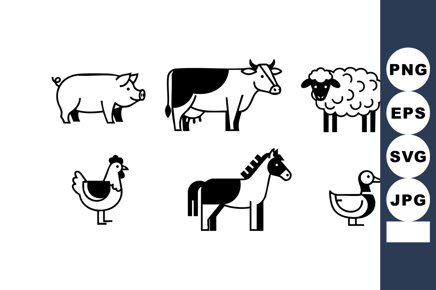 Vector illustration of six different farm animals including pig, cow, sheep, chicken, horse, and duck in minimalist black and white style. Clean and simple design, cheerful.