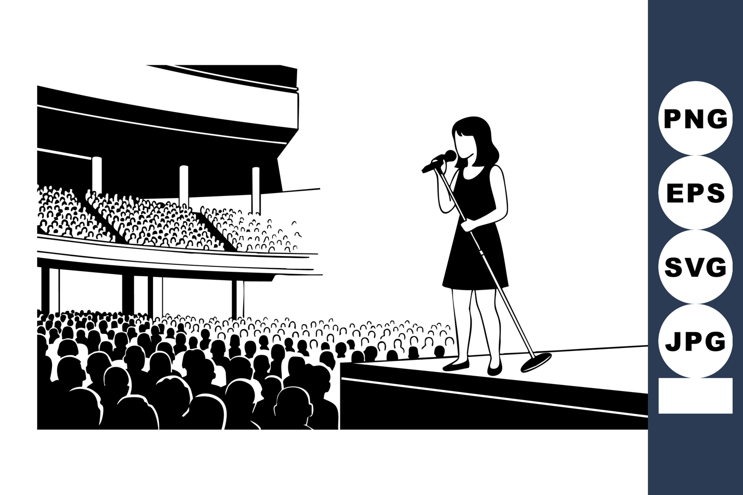Vector image shows a female singer holding a microphone and performing on stage with a large audience watching in a concert hall environment, depicted in black and white style, energetic mood.
