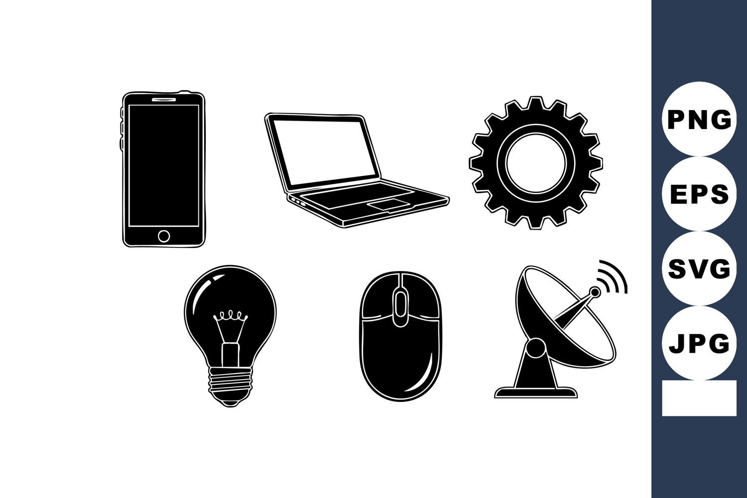 This vector illustration shows technology icons featuring a smartphone, laptop, gear, light bulb, computer mouse, and satellite in black silhouette style. Simple and modern mood.