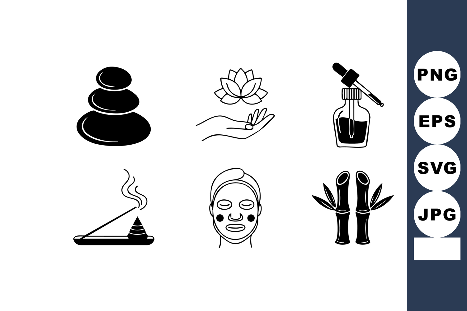 Set of spa and wellness icons including stacked stones, lotus flower, essential oil bottle, incense, face mask, and bamboo for relaxation and beauty themes, calm mood.
