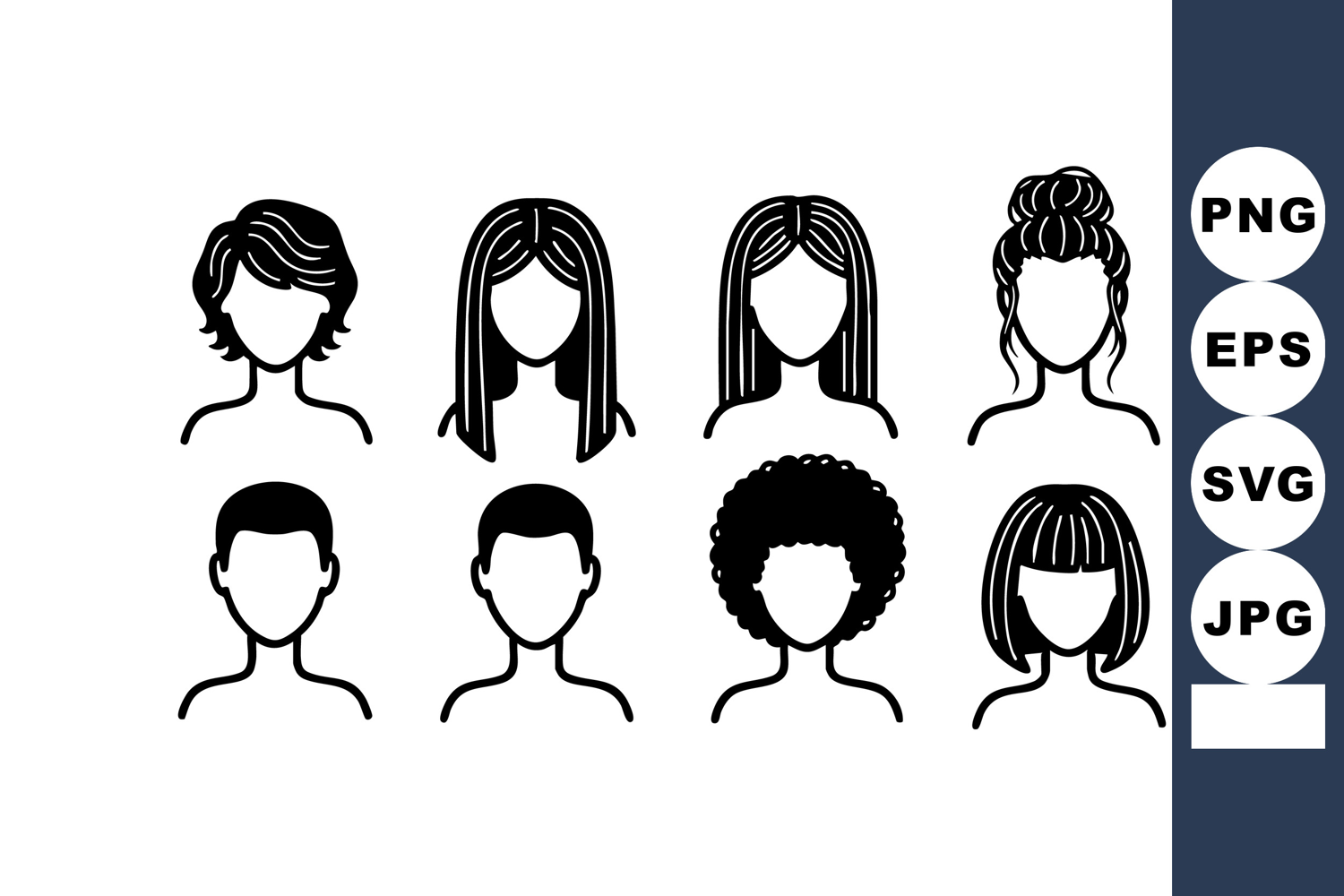 This vector features diverse female and male hairstyles with different hair textures and styles, ideal for beauty and fashion design projects. Clean black lines create a modern, versatile look. Stylish.