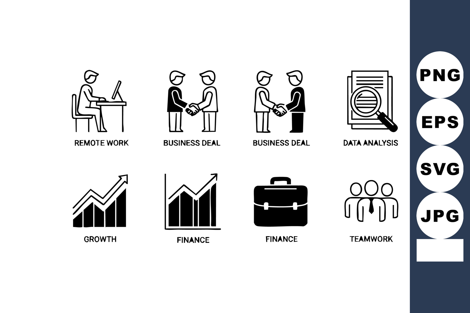 This vector file presents clean black and white icons representing remote work, business deals, data analysis, growth, finance, and teamwork concepts in a minimalist style, professional mood.