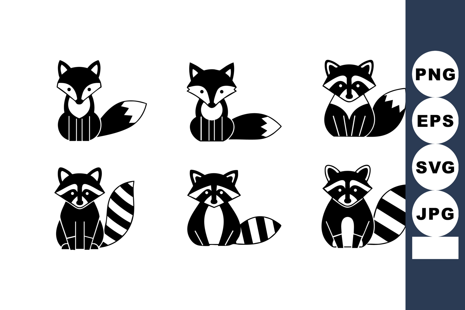 This vector features six black and white icons of foxes and raccoons with simple shapes and clean lines, ideal for nature-themed or children’s design projects. Playful mood.