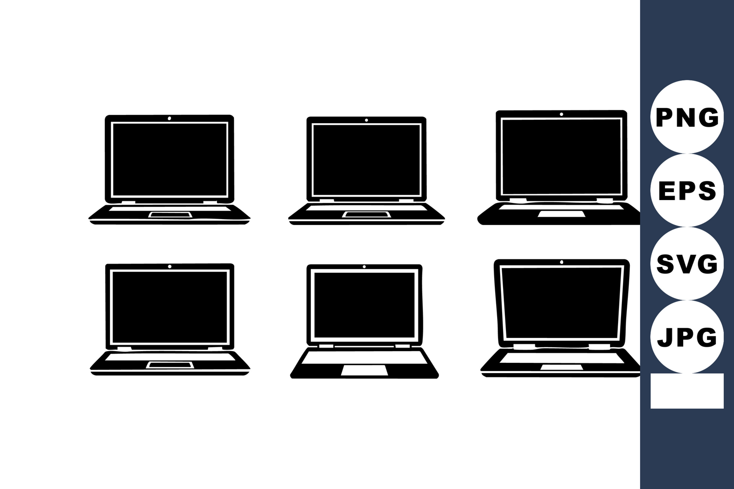 This vector image presents six laptop computer icons with open screens and keyboards, ideal for technology or digital communication projects. Clean black design with white background offers modern style. Functional and professional mood.