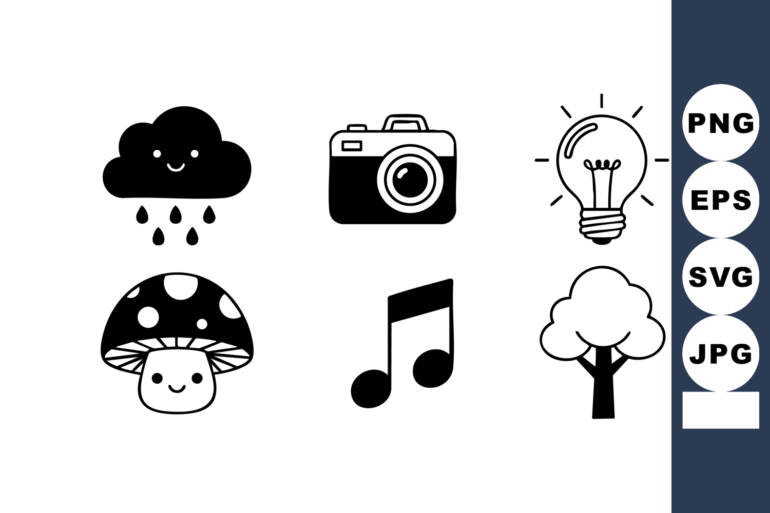 This vector illustration shows a cute rain cloud, mushroom, camera, music note, light bulb, and tree in black and white with simple shapes and cheerful expressions, playful mood.