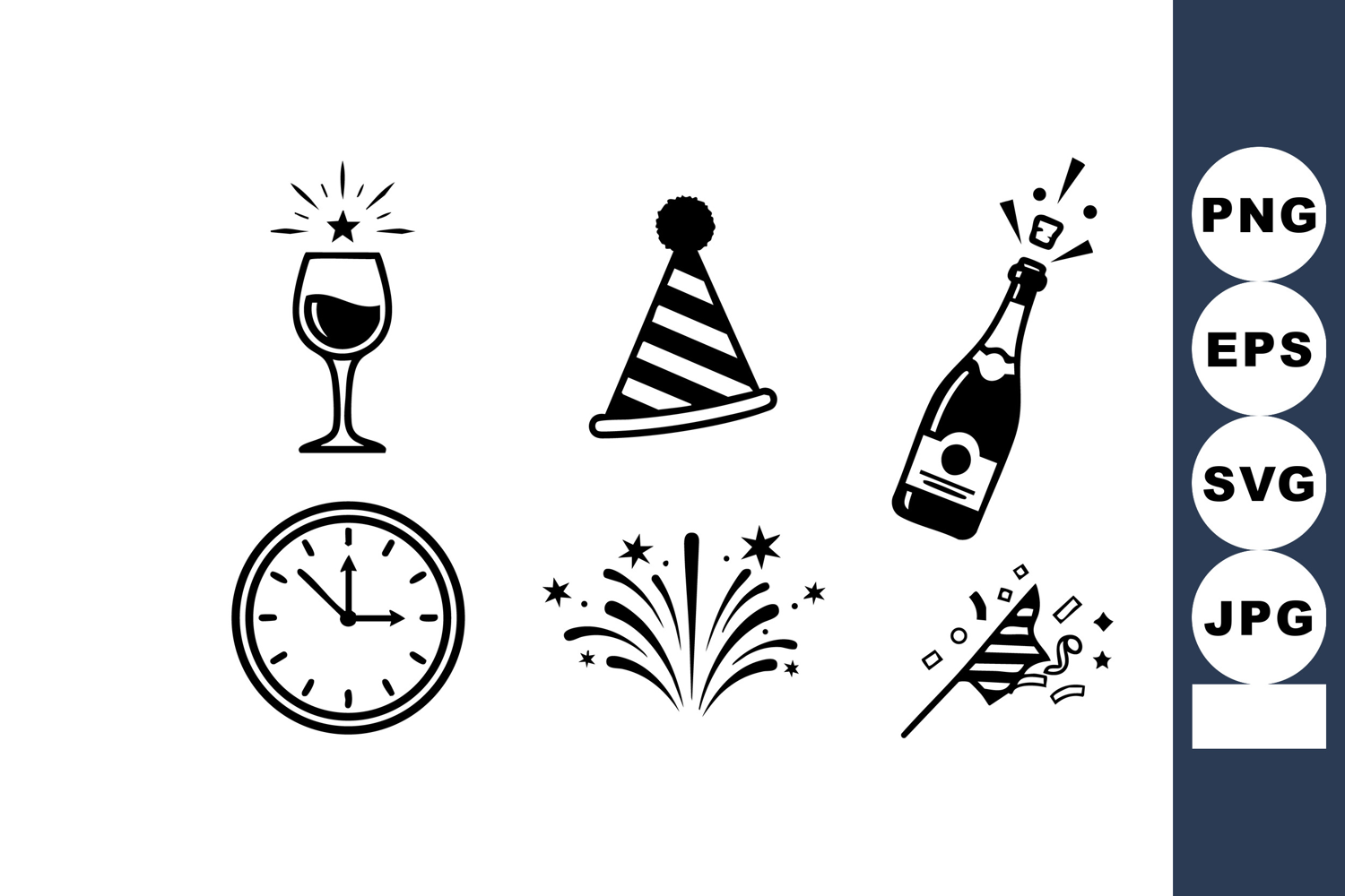 This vector illustration shows celebration icons including a wine glass, clock, party hat, champagne bottle, fireworks, and party popper. The design is festive and joyful.