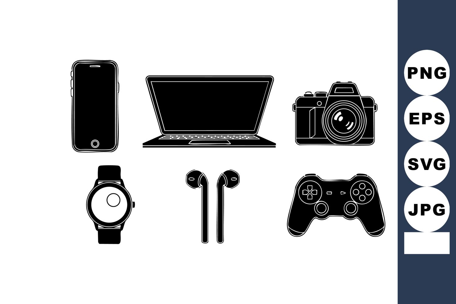 This vector illustration presents icons of common electronic devices including smartphone, laptop, camera, watch, earphones, and game controller in black silhouette style, simple and modern, clean design, minimalistic mood.