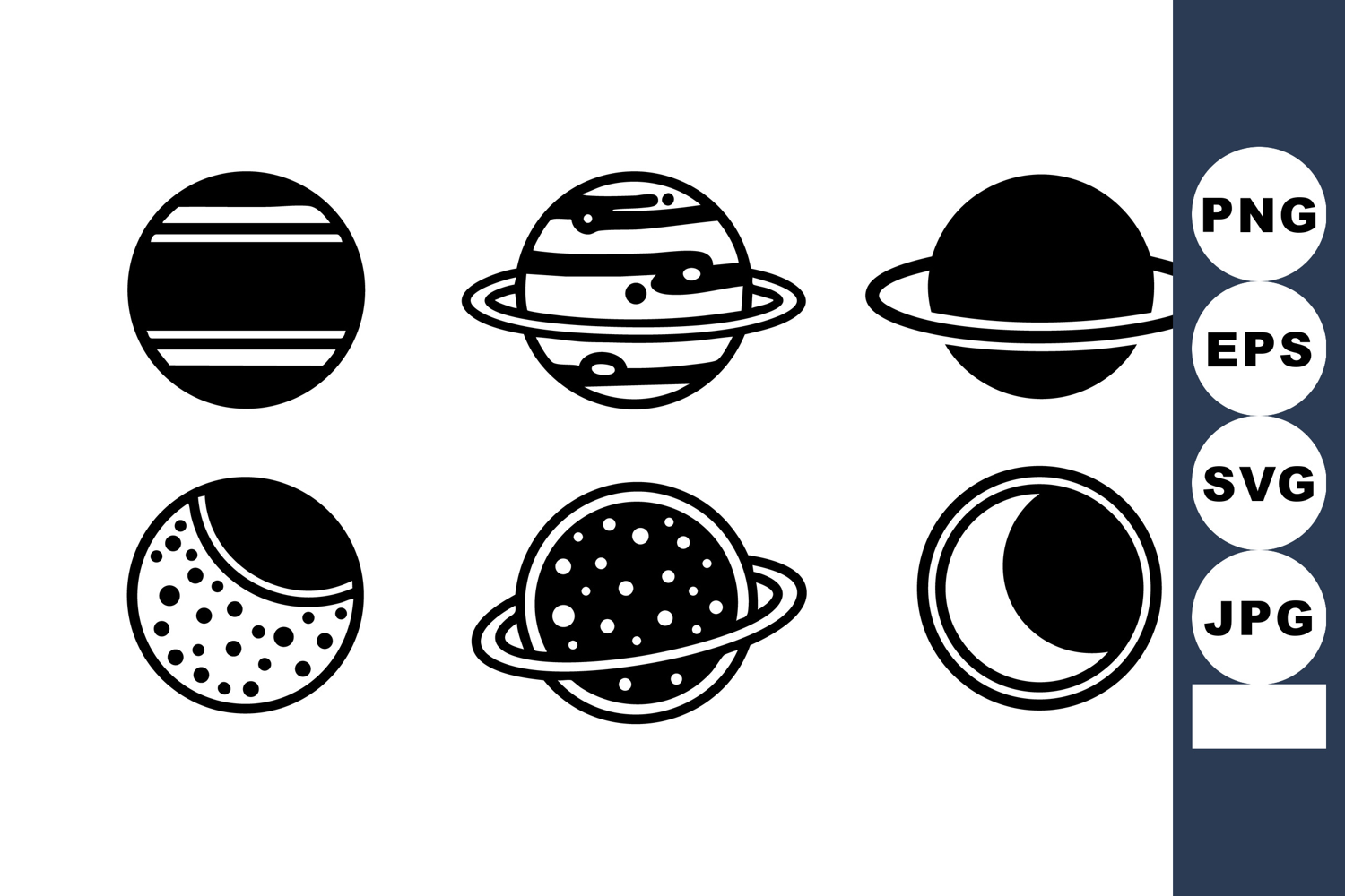 Vector set of six black and white planet icons featuring rings and moon phases, designed for space, astronomy, and science projects with a clean and minimal style. Calm.