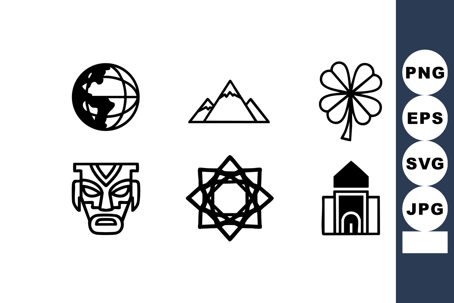 This vector set presents simple black icons representing global culture including earth, mountain, clover, tribal mask, star emblem, and building in clean line style, minimalistic and clear. Calm.