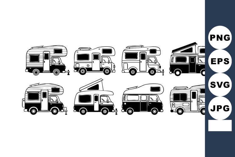 This vector image features a collection of camper van icons in black and white, showcasing different styles with rooftop tents and trailers, perfect for travel and adventure themes. Simple and clear design creates a nostalgic mood.