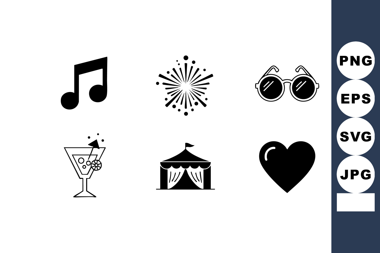 Vector image showing a collection of party icons including music note, cocktail glass, fireworks, sunglasses, tent, and heart shapes in black style. Festive and simple.