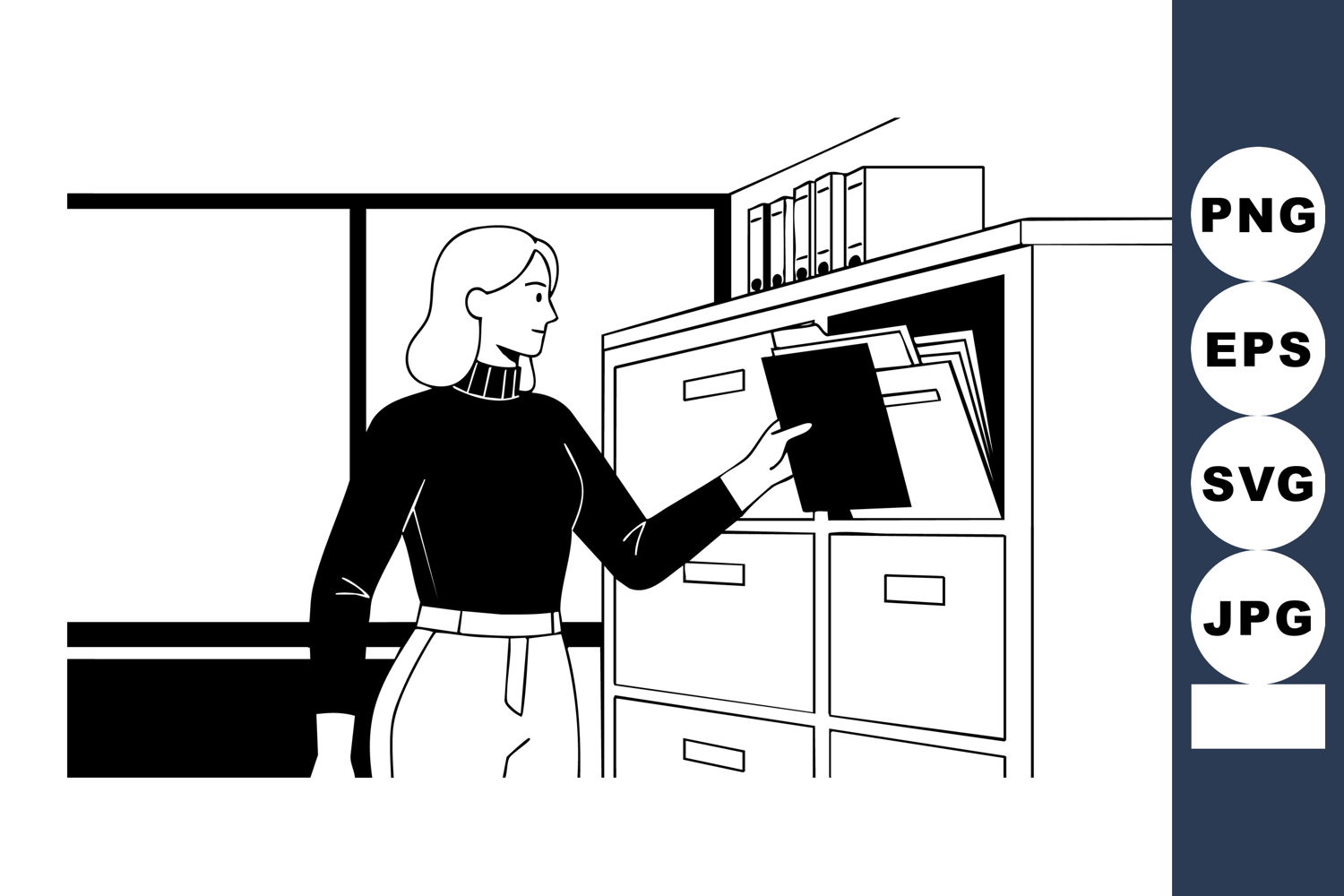 Woman organizing files in office cabinet vector illustration example image 1