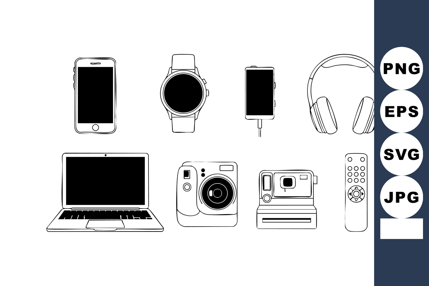 Vector image featuring electronic gadgets including smartphone, laptop, cameras, smartwatch, headphones, and remote control in black and white line style. Modern and minimalistic mood.