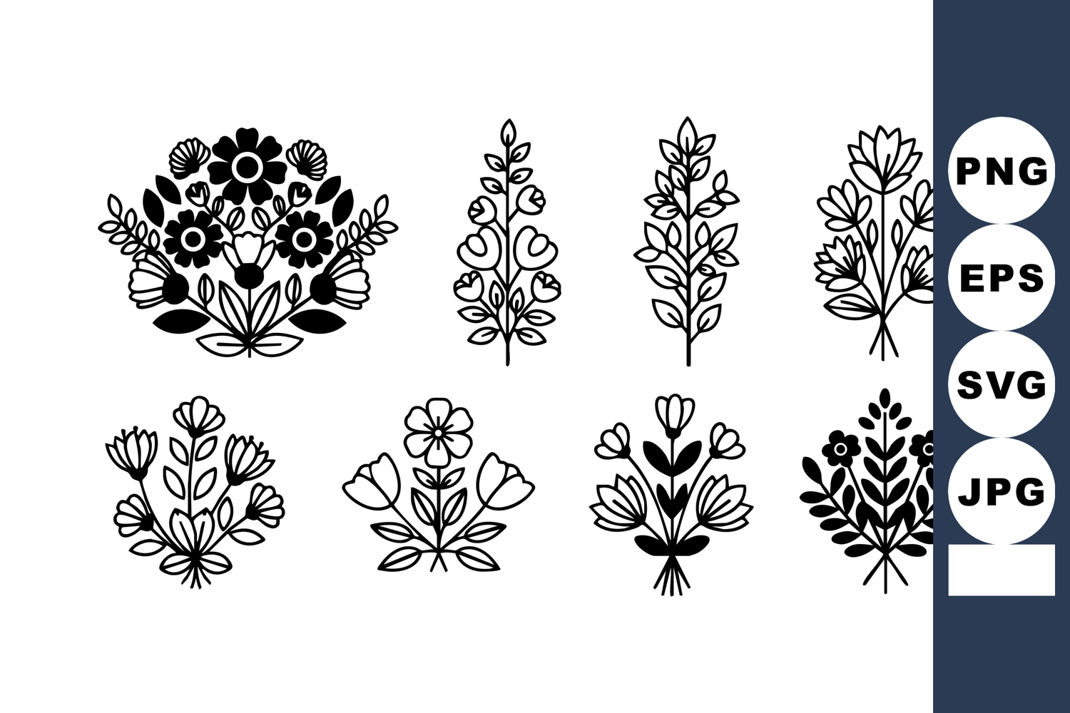 This vector features vintage floral designs with stylized flower bouquets and leafy branches in black and white, perfect for decorative and elegant projects, classic and timeless mood.