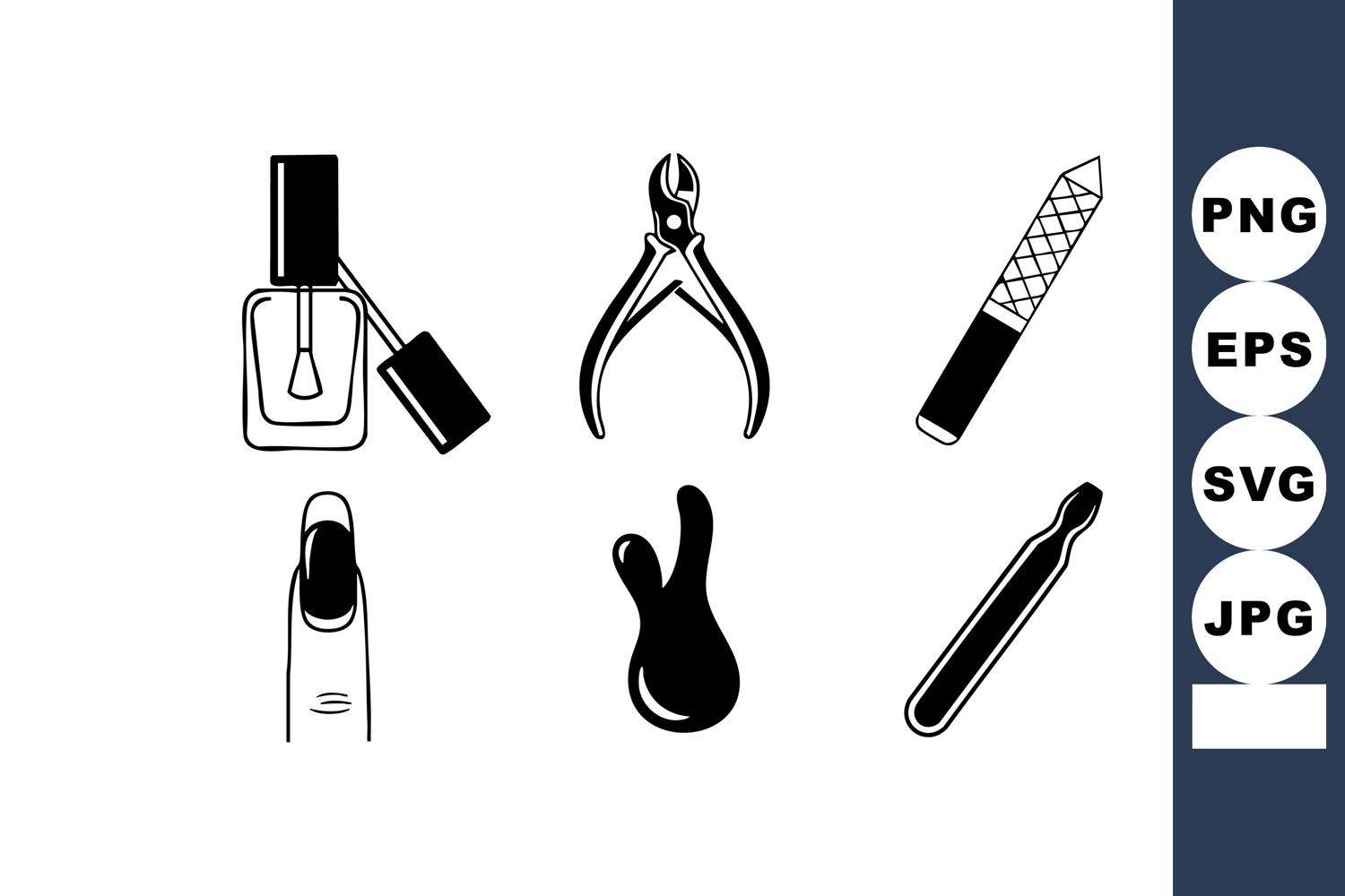 Vector illustration showing black and white manicure and pedicure tools including nail polish, clipper, files, and cuticle pusher in simple style, clean and minimal, professional design.