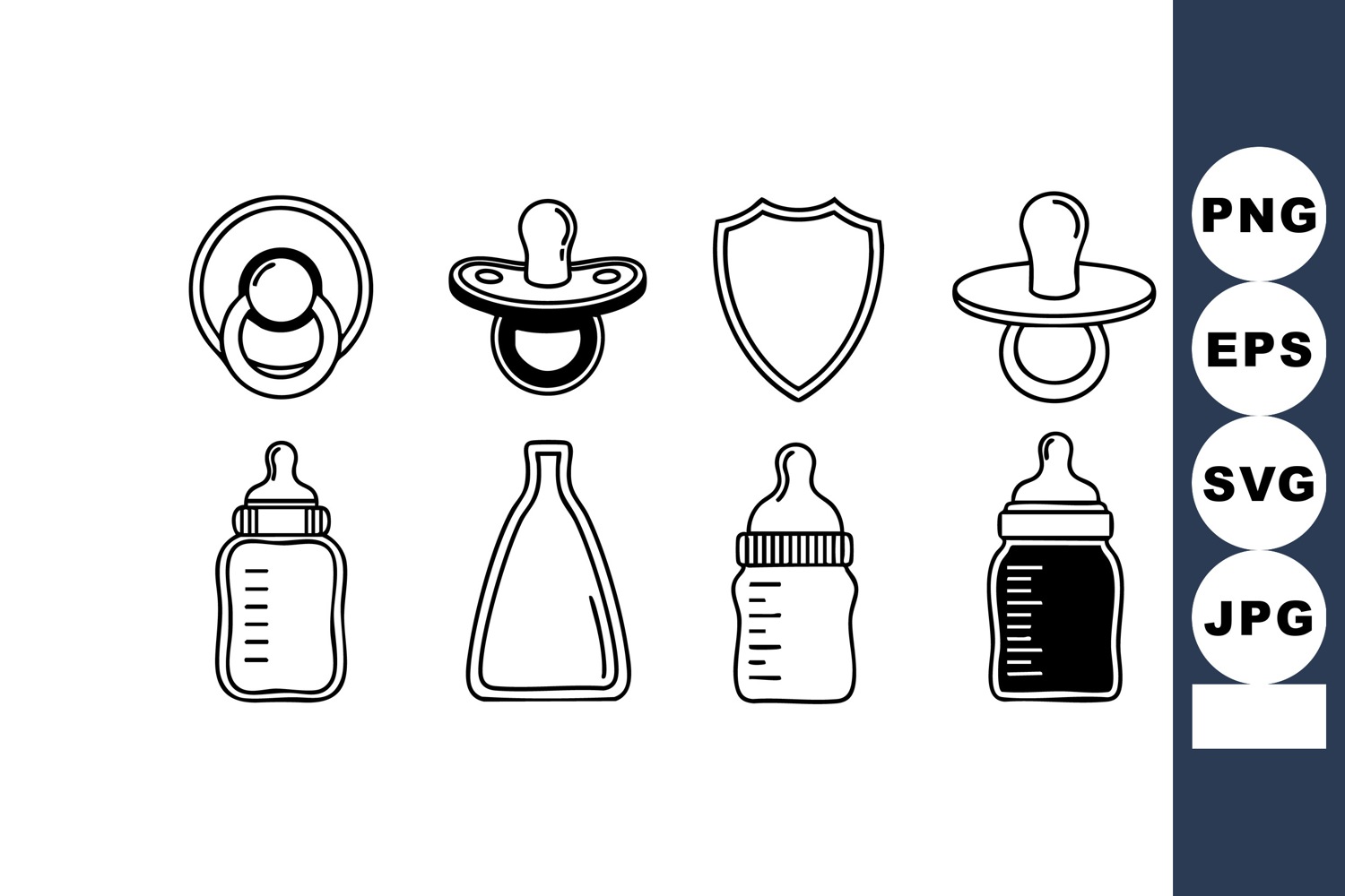 This vector set features baby pacifiers and feeding bottles in both outline and filled black styles. It suits infant care themes and minimalist design projects, offering clarity and versatility. Calm.