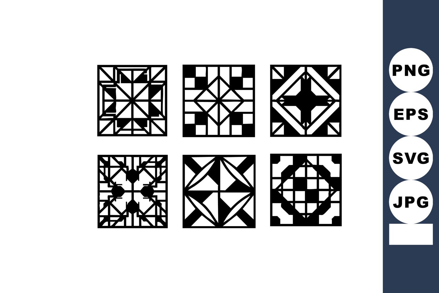 This vector file displays six distinct black and white geometric square patterns, featuring sharp lines and symmetrical shapes, designed for artistic and decorative applications. Clean and modern mood.