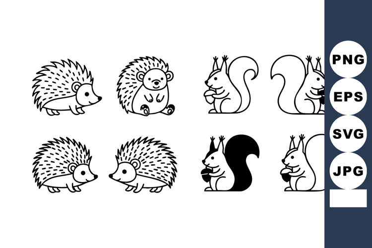 Illustration Cartoon Animal Vector Outline Black Cute White Squirrel Hedgehog