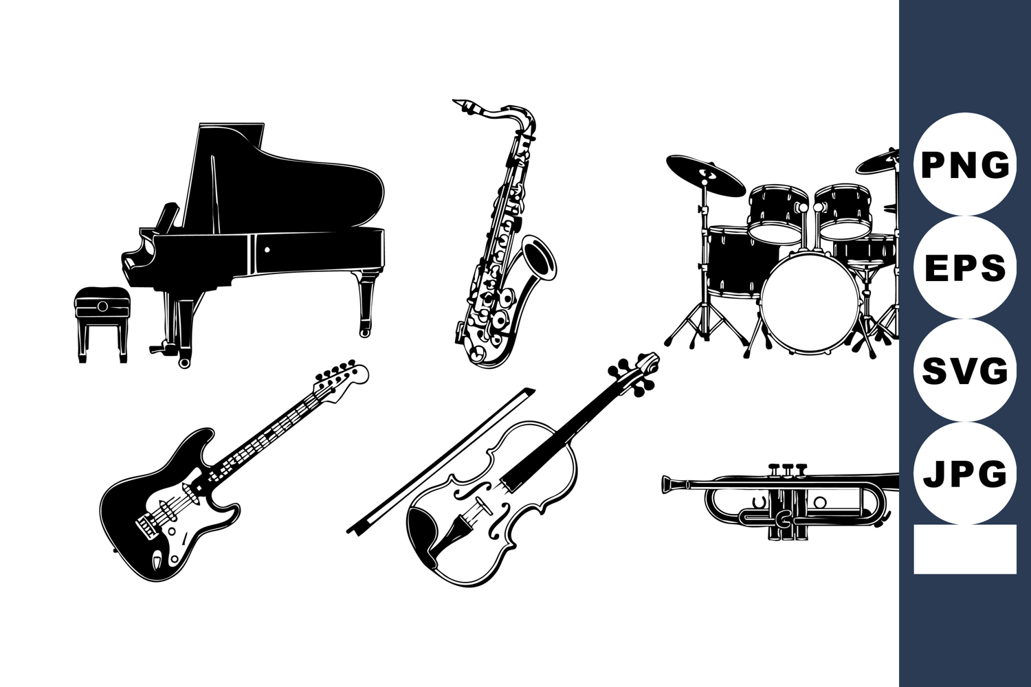 This vector file shows a collection of musical instruments including a piano, saxophone, drum set, electric guitar, violin, and trumpet in black silhouette style. Artistic and elegant.