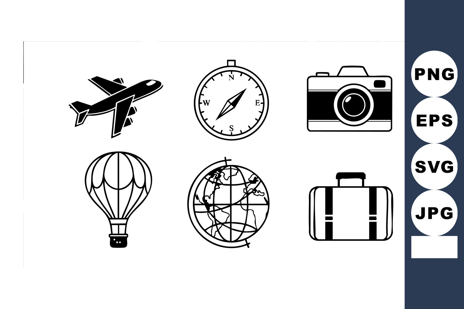 Vector travel icons featuring airplane, compass, camera, hot air balloon, globe, and suitcase in black outline style, suitable for travel and adventure themes. Simple and clear design, professional.