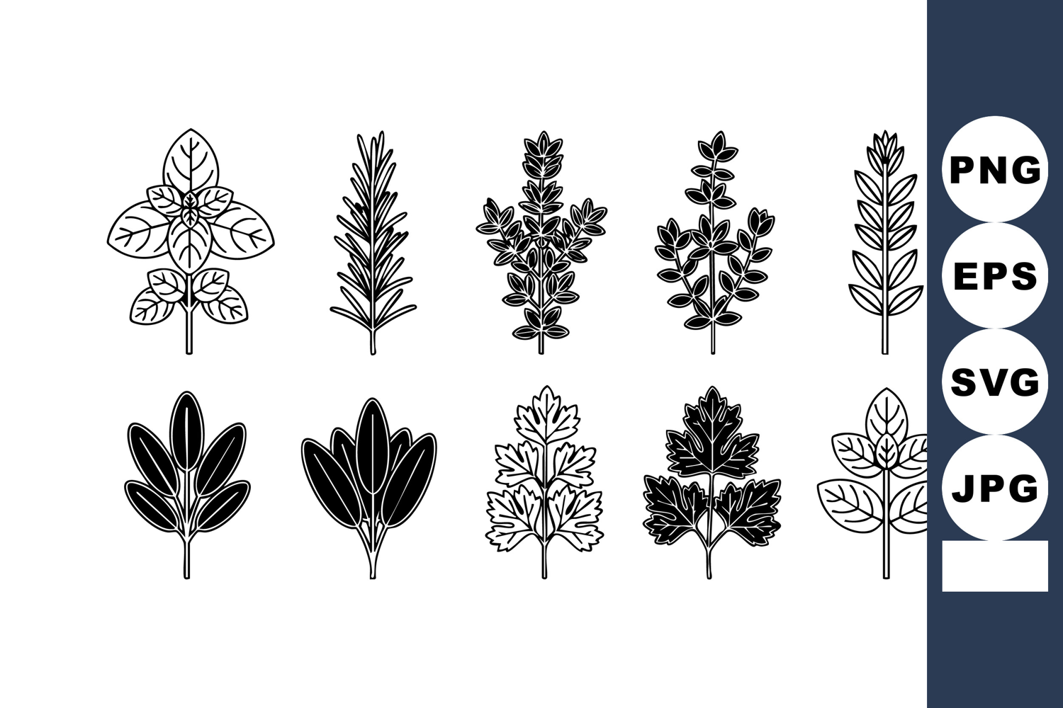 This vector file features ten black and white stylized leaf icons with various botanical shapes, perfect for nature-themed designs or creative artwork. Elegant and minimalistic mood.